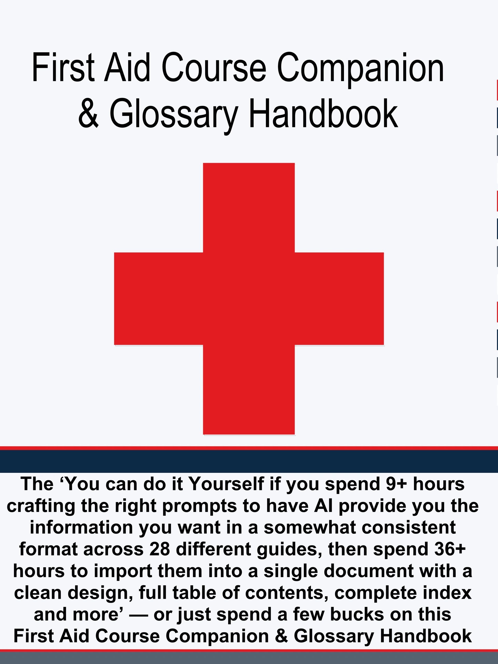 First Aid Course Companion & Glossary Handbook distills every major U.S. first-aid course into clear, quick-reference briefs. Use it to review core skills, compare certifications, and learn the tools and supplies you’ll actually use. Packed with mnemonics, red-flags, and plain-English A→Z glossaries, great reference.